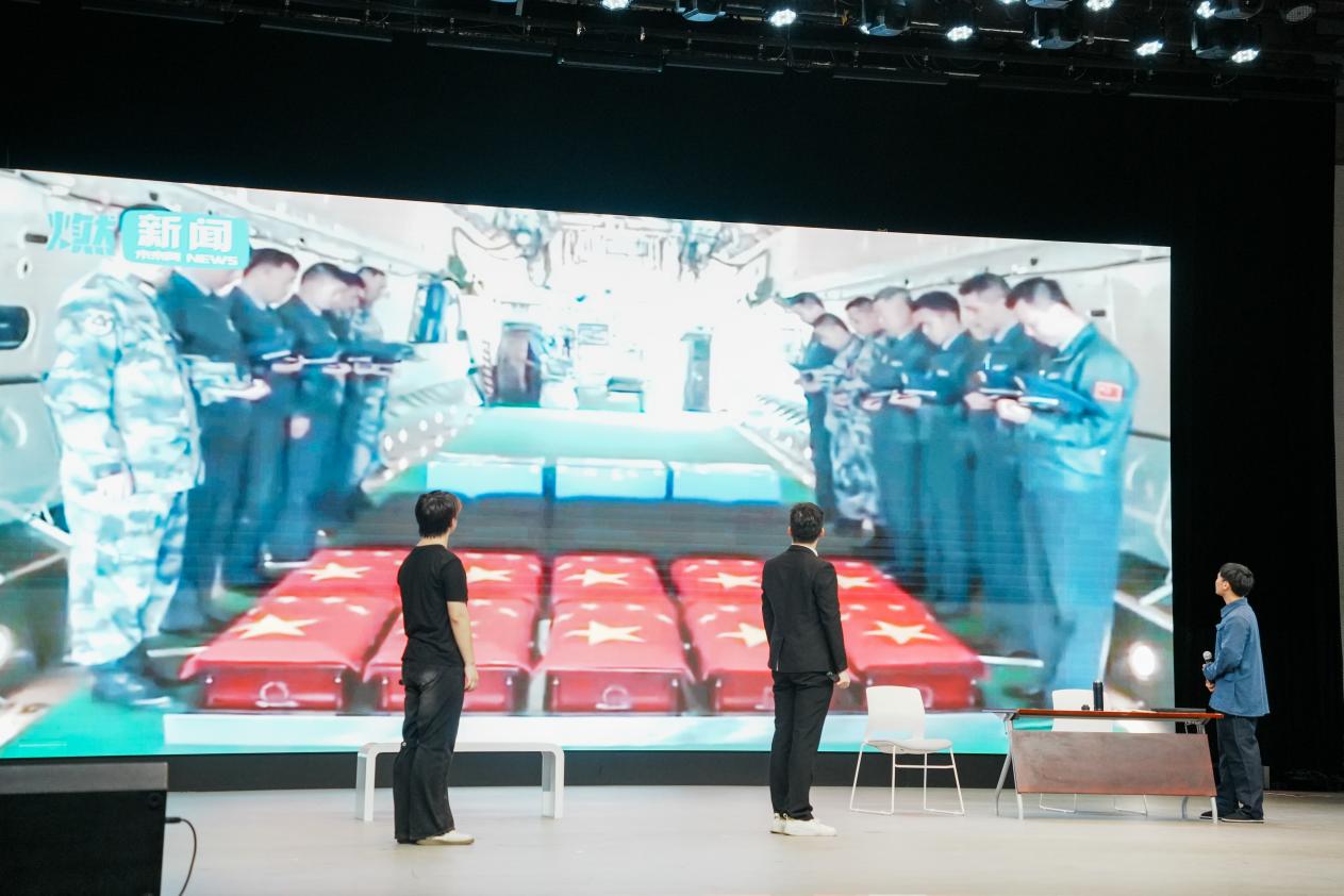 “我不后悔,我知道,国家和人民没忘记我们,直到有一天,我的遗骨被发掘了出来,和我一起牺牲的战友说,祖国来接我们了……”活动在“悦霖影话剧社”带来的红色话剧《英雄》中展开。在话剧中,三位不同时代的“英雄”意外相遇,在幽默与争执中,交织着关于牺牲、记忆与价值的深刻对话,展现了革命先烈坚定的理想信念与不屈精神。演员们深情演绎先辈的事迹,现场氛围庄重而感人,引发新生们的强烈共鸣,掌声不断。