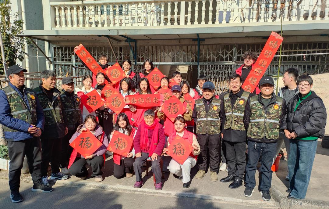 重温历史之后,党员师生向烈士老母亲送上慰问与关怀,表达对英雄的崇高敬意和对家属的深切牵挂;老兵们也送上了暖心的冬被,现场气氛庄重而温馨。老兵顾建才即席挥毫,为师生写下吉祥的“福”字,更专门为烈士母亲题写一副饱含敬意的春联。笔墨之间,传递的是对历史的铭记,更是对未来的美好祝愿。