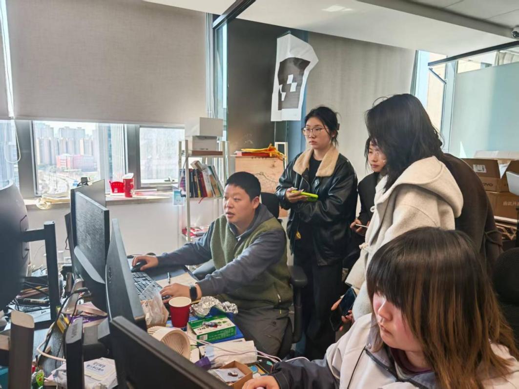 随后,师生们深入企业办公一线,实地观摩了数字孪生项目全流程开发。技术工程师现场演示了前端页面开发、三维场景调试、交互功能迭代、平台系统集成等核心工作环节,详细拆解了从需求分析、UI/UX设计、三维资产制作到最终项目上线的完整链路,直观展示了数媒专业的交互设计、视觉设计、三维建模等核心能力在实际项目中的落地应用。同学们围绕数字孪生场景的艺术化表达、前端交互的用户体验优化、实时渲染技术的行业应用等专业方向积极提问,工程师们结合从业经验逐一解答,为同学们的专业学习、技能提升与职业规划提供了宝贵的行业视角。