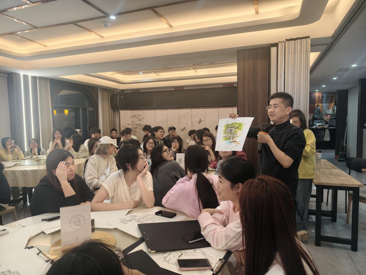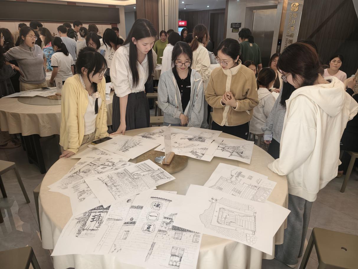 白天,老师全程陪伴指导,针对学生构图、透视等问题一对一示范讲解,引导其观察空间、提炼元素。同学们投入写生实践,将古建风貌转化为手绘作品,在反复练习中实现手绘能力与设计思维双重提升。晚上开展作品复盘交流会,师生相互展示作品、分享心得,老师点评并梳理设计逻辑,还引导学生将写生元素与现代室内设计结合积累素材,同学们踊跃探讨,深化专业认知,氛围浓厚。